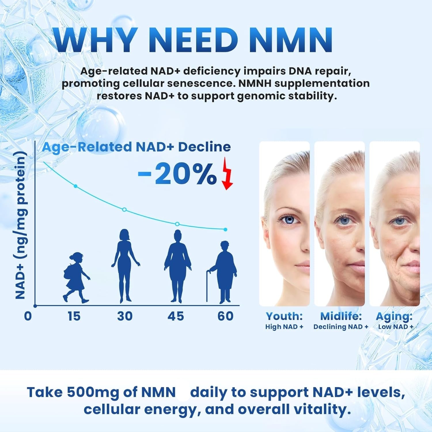 Consistently taking NMN provides your body with the raw material it needs to produce NAD+ and maintain optimal cellular function.